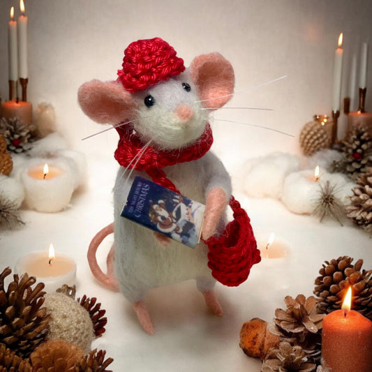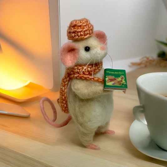 Needle-Felted Mouse with Book – Handmade Natural Fiber Art Doll | Whimsical Woodland Decor Collectible Dressed Figurine