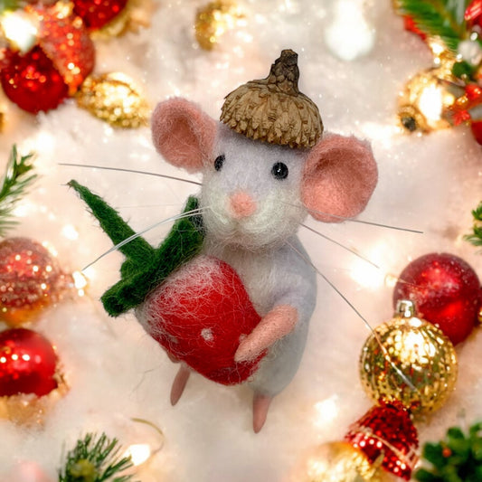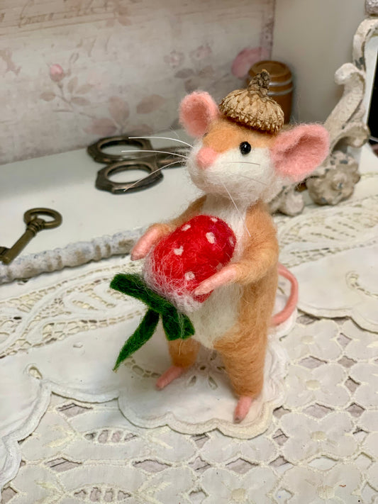 Needle-Felted Mouse with Strawberry – Handmade Natural Fiber Art Doll | Whimsical Woodland Decor Collectible Dressed Figurine