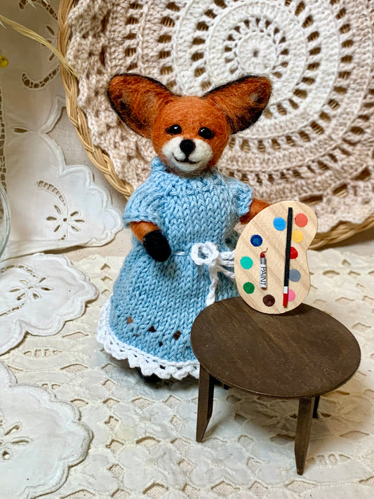 Needle Felted Fox Artist – Tessa in Blue Knit Dress | Handmade Wool Animal Figurine | Miniature Woodland Art Doll | Fox Gift
