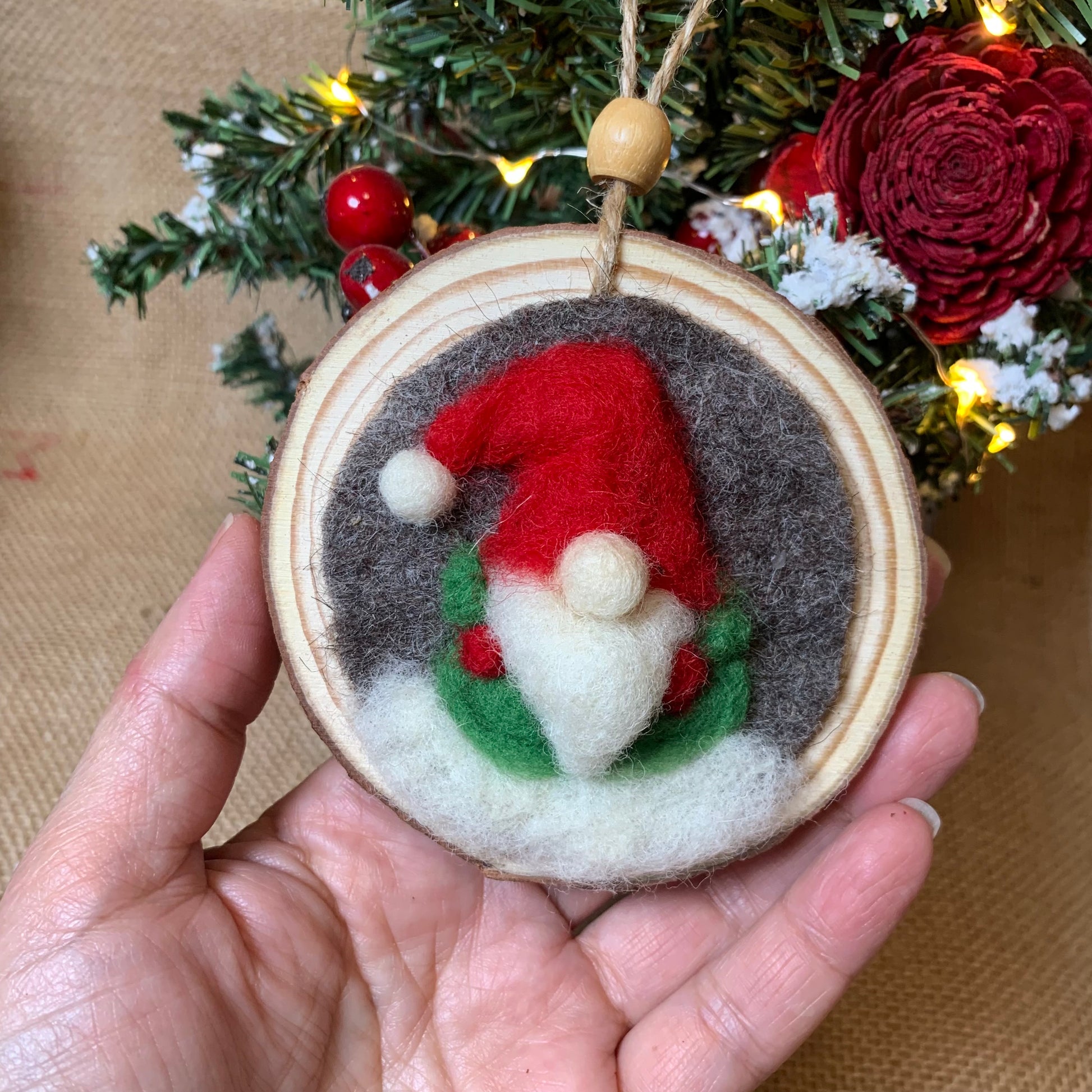 Handmade Christmas Gnome Wool Ornament, Felt Holiday Decor– Nordic Tomte – Rustic Wood Slice Holiday Gift